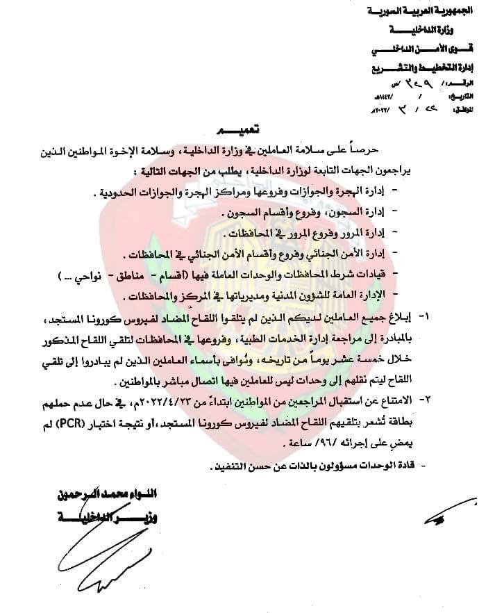 وكانت وزارة الداخلية السورية أصدرت تعليمات جديدة بخصوص تلقي لقاح كورونا، قضت بإلزام تلقيه على بعض العاملين والمراجعين للجهات التابعة للوزارة.