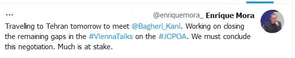 وكتب منسق الاتحاد الاوروبي لمفاوضات فيينا ومساعد مسؤول السياسة الخارجية للاتحاد انريكي مورا في تغريدة له على موقع تويتر مساء الجمعة: ساقوم بزيارة الى طهران غدا للقاء مع علي باقري. سنبذل جهودنا من اجل ردم الفجوات المتبقية في مفاوضات فيينا.