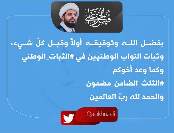 وقال الخزعلي في تغريدته عبر تويتر "بفضل الله وتوفيقه أولا وقبل كل شيء وثبات النواب الوطنيين بالثبات الوطني وكما وعد أخوكم الثلث الضامن مضمون".