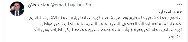 وقال باجلان في سلسلة تغريدات بتويتر :"حملة اعتذار، سأقوم بحملة شعبية لتنظيم وفد من شعب كردستان لزيارة النجف الاشرف لتقديم الاعتذار لسماحة آية الله العظمى السيد علي السيستاني لما بدر من مواطن كردستاني تجاه المرجعية ولوأد الفتنة ودعم نسيج مجتمعنا بكل اطيافه ومن الله التوفيق".