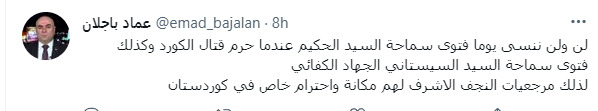 ولفت باجلان "لن ولن ننسى يوما فتوى سماحة السيد الحكيم عندما حرم قتال الكورد وكذلك فتوى سماحة السيد السيستاني الجهاد الكفائي لذلك مرجعيات النجف الاشرف لهم مكانة واحترام خاص في كوردستان".