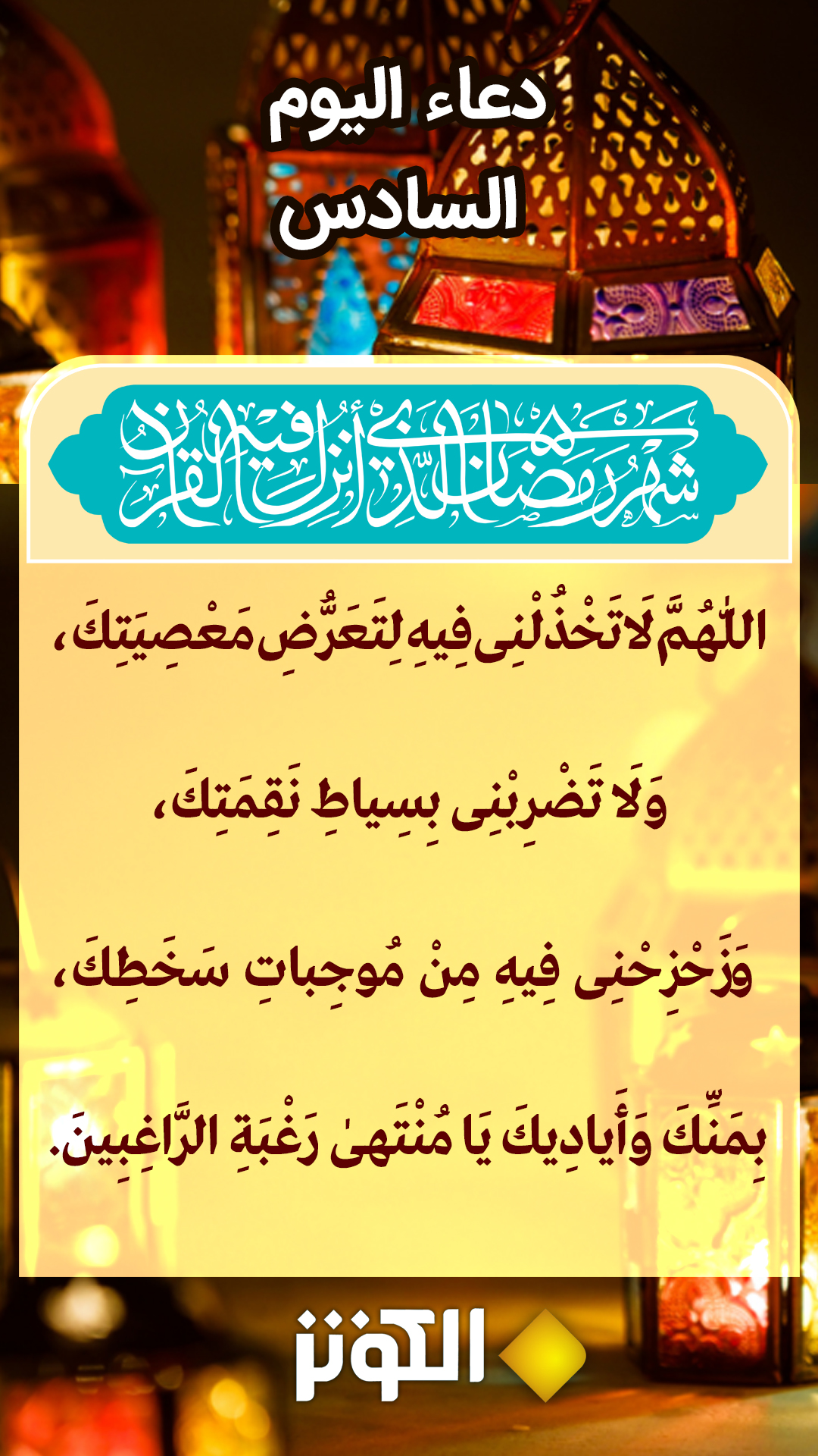 "اللَّهُمَّ لا تَخْذُلْنِي فِيْهِ لِتَعَرُّضِ مَعْصِيَتِكَ، وَلا تَضْرِبْنِي بِسِياطِ نَقْمَتِكَ، وَزَحْزِحْنِيِ فِيْهِ مِنْ مُوجِباتِ سَخَطِكَ، بِمَنِّكَ وَأَيادِيكَ يا مُنْتَهى رَغْبَةِ الرَّاغِبِينَ". المصدر: مفاتيح الجنان