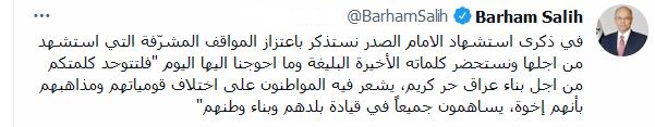 وقال صالح في تغريدة على حسابه في تويتر: " في ذكرى استشهاد الامام الصدر نستذكر باعتزاز المواقف المشرّفة التي استشهد من اجلها ونستحضر كلماته الأخيرة البليغة وما احوجنا اليها اليوم "فلتتوحد كلمتكم من اجل بناء عراق حر كريم، يشعر فيه المواطنون على اختلاف قومياتهم ومذاهبهم بأنهم إخوة، يساهمون جميعاً في قيادة بلدهم وبناء وطنهم".