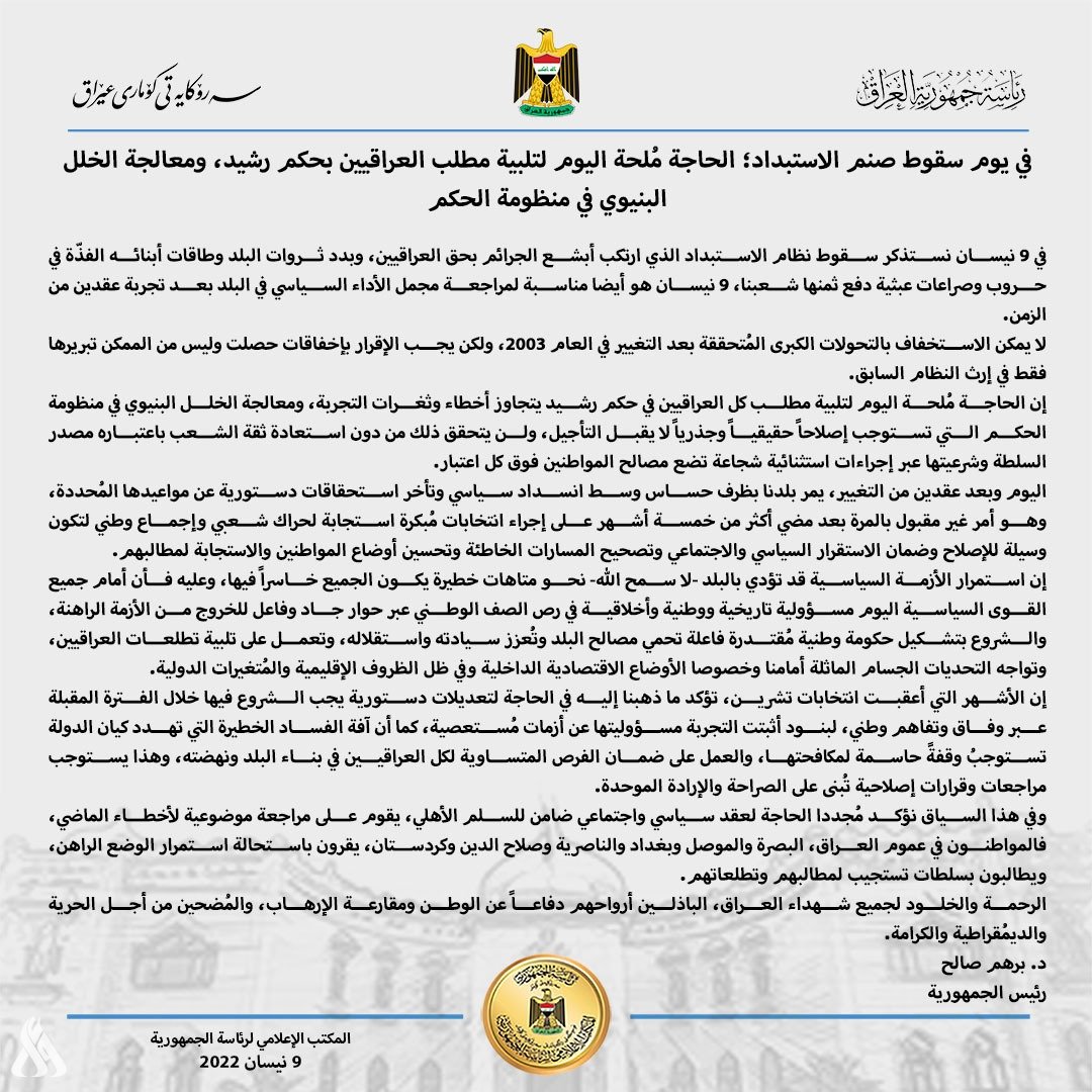 وقال صالح في بيان: "في 9 نيسان نستذكر سقوط نظام الاستبداد الذي ارتكب أبشع الجرائم بحق العراقيين، وبدد ثروات البلد وطاقات أبنائه الفذّة في حروب وصراعات عبثية دفع ثمنها شعبنا، 9 نيسان هو أيضا مناسبة لمراجعة مجمل الأداء السياسي في البلد بعد تجربة عقدين من الزمن".