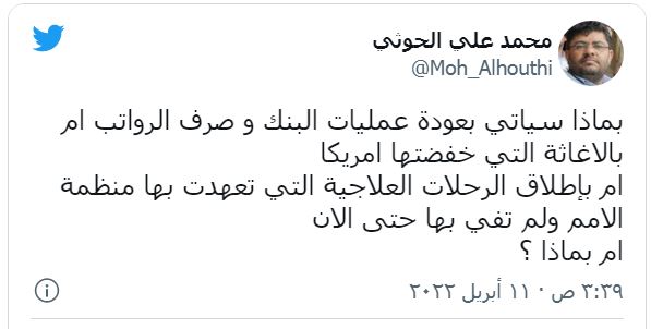 وكتب الحوثي على "تويتر": "بماذا سيأتي بعودة عمليات البنك وصرف الرواتب، أم بالإغاثة التي خفضتها أمريكا أم بإطلاق الرحلات العلاجية التي تعهدت بها منظمة الأمم المتحدة، ولم تفي بها حتى الآن، أم بماذا؟". ومن المنتظر أن يصل المبعوث الأممي إلى اليمن هانس غروندبرغ، الاثنين إلى صنعاء في زيارة هي الأولى منذ توليه المنصب.