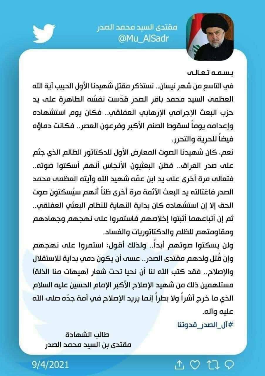 وقال السيد الصدر في تغريدة له عبر تويتر: في التاسع من شهر نيسان... نستذكر مقتل شهيدنا الأول الحبيب أية الله العظمى السيد محمد باقر الصدر.