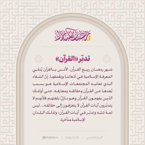 شهر رمضان هو ربيع «القرآن» أيضاً. الأُنس بـ«القرآن» ينّمي المعرفة الإسلامية في أذهاننا ويعمّقها. إن الشقاء الذي تعانيه المجتمعات الإسلامية هو بسبب بُعدها عن «القرآن» وحقائقه ومعارفه. والأشخاص المسلمون الذين لا يفهمون معاني «القرآن» ولا يأنسون بها وضعهم معلوم. لكن حتى أولئك الذين يفهمون «القرآن» وهو نازلٌ بلغتهم فلأنهم لا يتدبرون آياتِ «القرآن» لا يتعرّفون إلى حقائقه ولا يأنسون بها ولذلك البلدان الإسلامية متأخرة.