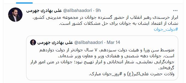 وكتب بهادري جهرمي في تغريدة له على موقع تويتر مساء الثلاثاء في الاشارة الى تغريدة سابقة له حول معدل اعمار الشباب في الحكومة الثالثة عشر الحالية بالمقارنة مع الحكومة الثانية عشرة السابقة: ان إعراب قائد الثورة عن سروره ازاء الحضور الواسع للشباب في مجموعة ادارة البلاد، مؤشر لثقته بالشباب لحل مشاكل البلاد.