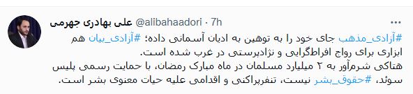 وكتب بهادري جهرمي في تغريدة له على موقع تويتر فجر اليوم الاثنين: ان حرية الاديان قد تركت مكانها للاساءة الى الاديان السماوية؛ حرية التعبير اصبحت ايضا اداة لترويج التطرف والعنصرية في الغرب.