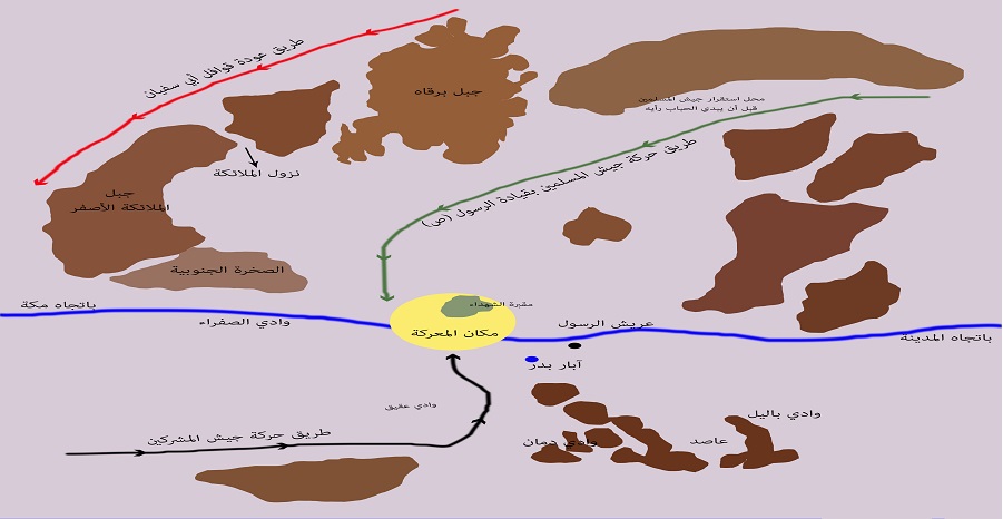 ففرح بذلك رسول الله (ص) وقال: «سيروا على بركة الله، فإنّ الله عزّ وجلّ قد وعدني إحدى الطائفتين، ولن يخلف الله وعده، والله كأنّي أنظر إلى مصرع أبي جهل بن هشام وعتبة بن ربيعة وشيبة بن ربيعة، وفلان وفلان».