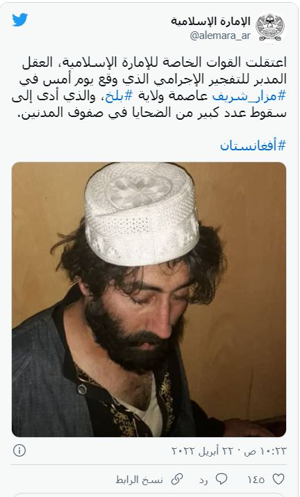 وقالت "طالبان" على حسابها "الإمارة الإسلامية" في "تويتر": "اعتقلت القوات الخاصة للإمارة الإسلامية، العقل المدبر للتفجير الإجرامي الذي وقع يوم أمس في مزار شریف عاصمة ولاية بلخ، والذي أدى إلى سقوط عدد كبير من الضحايا في صفوف المدنين".