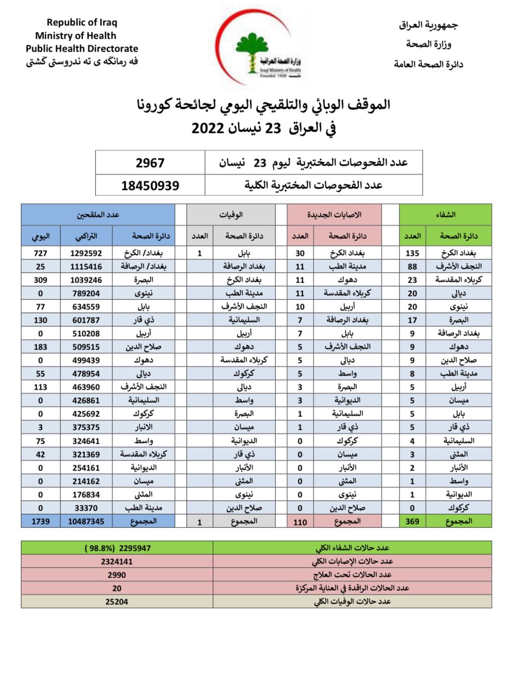 وقالت الوزارة في بيان، إنها سجلت 110 إصابات جديدة، مقابل تماثل 369 حالة للشفاء، مع حالة وفاة واحدة بالفيروس. وأشارت إلى تلقي 1739 شخصاً للقاح كورونا في يوم واحد.