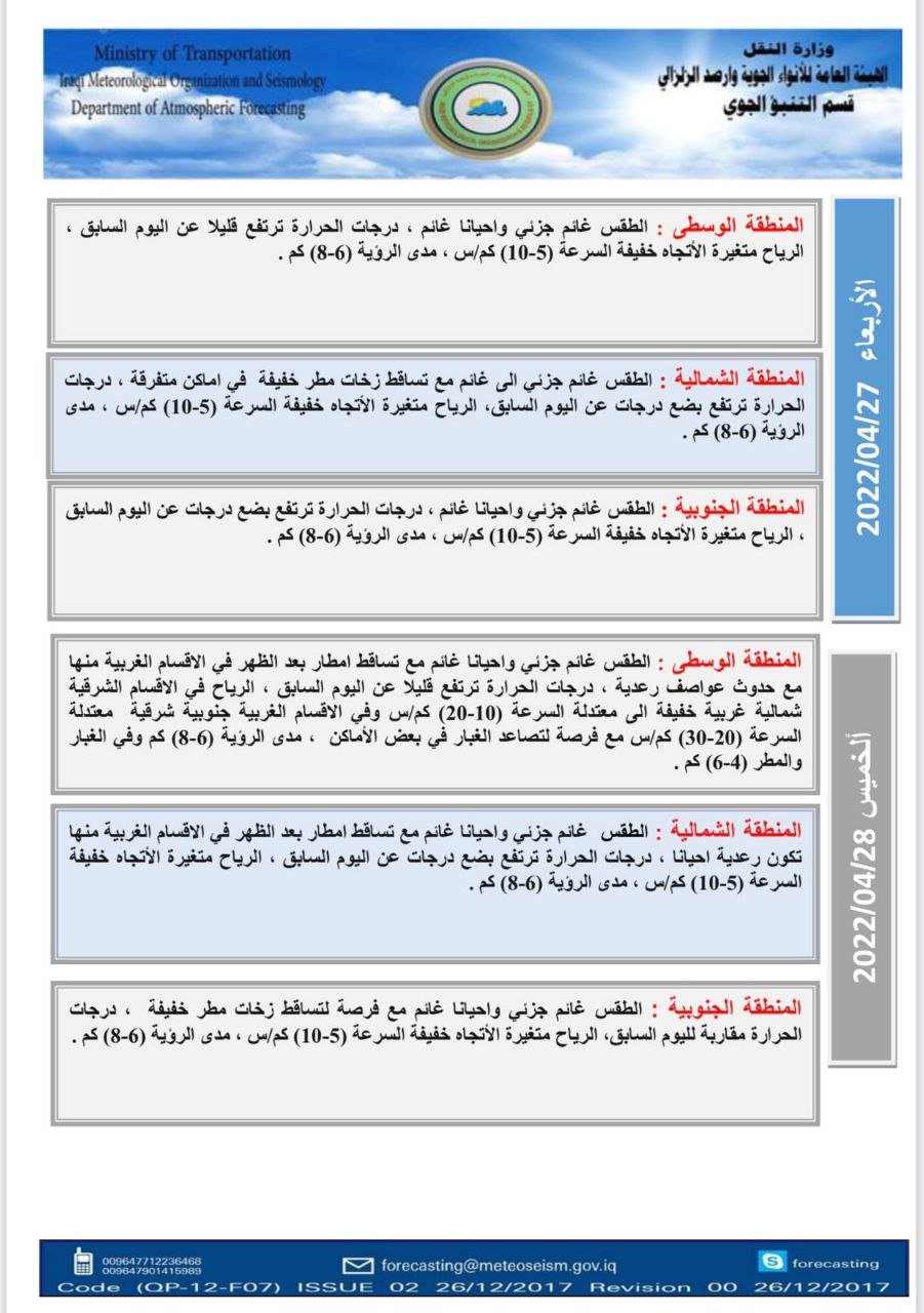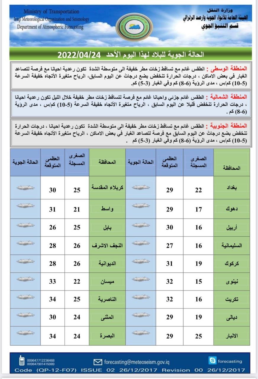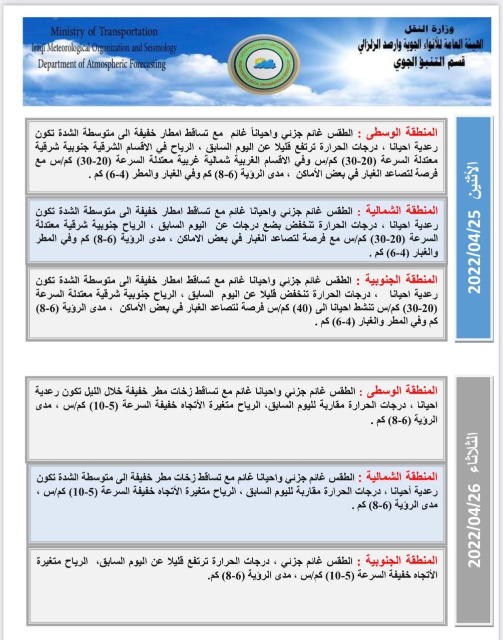ووفق توقعات الهيئة التي أوردتها في جداول ، فإن الطقس في المناطق الوسطى والجنوبية والشمالية، سيشهد اليوم تساقط أمطار بعضها خفيفة وأخرى رعدية في بعض الأماكن، مع انخفاض درجات الحرارة بضع درجات.