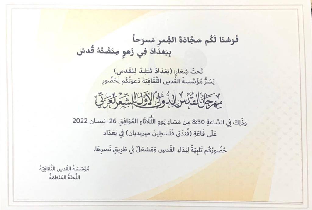 وفي السياق قال السفير الفلسطيني في بغداد، أحمد عقل، لوكالة الأنباء العراقية (واع)، إن "فعاليات مهرجان القدس الدولي الأول للشعر العربي، تنطلق في تمام الساعة التاسعة من مساء يوم الثلاثاء الموافق 26/ نيسان/ 2022، بمشاركة شعراء عراقيين وفلسطينيين، على قاعة "تموز" في فندق فلسطين ميريديان".