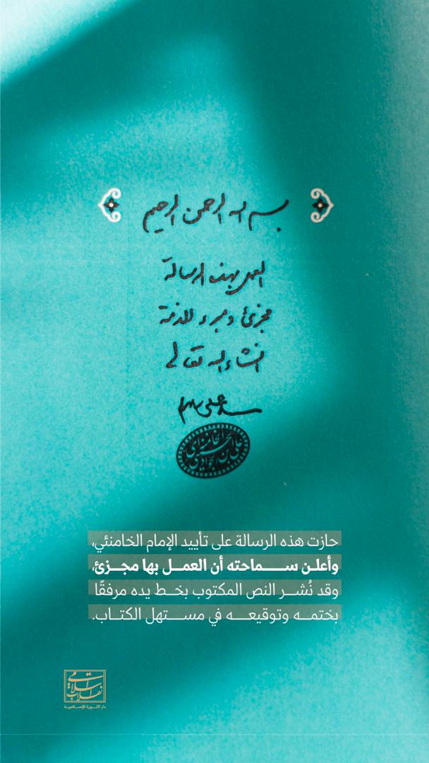 وحازت هذه الرسالة على تأييد قائد الثورة الامام الخامنئي، حيث أعلن سماحته أن العمل بها مجزئ، وقد نُشر النص المكتوب بخط يده مرفقاً بختمه وتوقيعه في مستهل الكتاب.