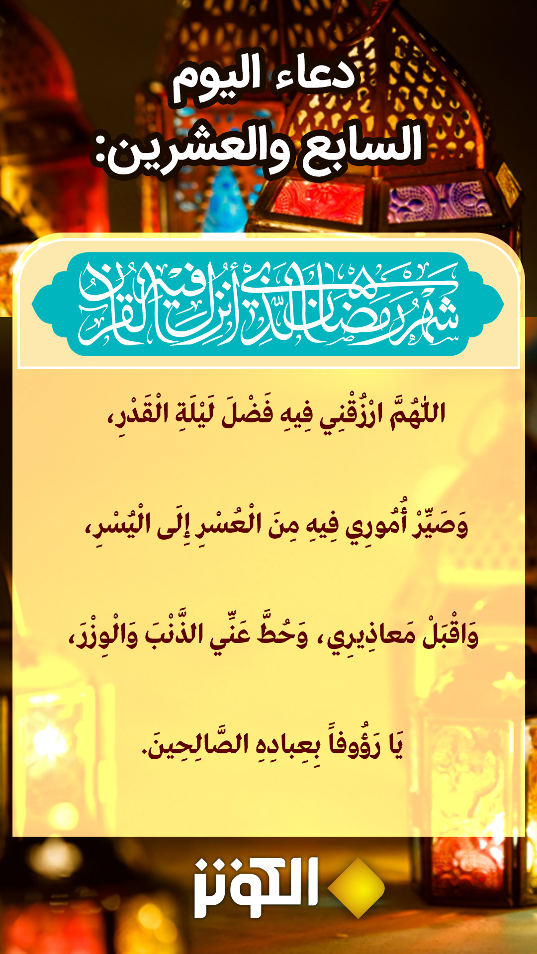 اللّهُمَّ ارْزُقني فيهِ فَضْلَ لَيلَةِ القَدرِ وَ صَيِّرْ اُمُوري فيهِ مِنَ العُسرِ إلى اليُسرِ وَ اقبَلْ مَعاذيري وَ حُطَّ عَنِّي الذَّنب وَ الوِزْرَ يا رَؤُوفاً بِعِبادِهِ الصّالحينَ .