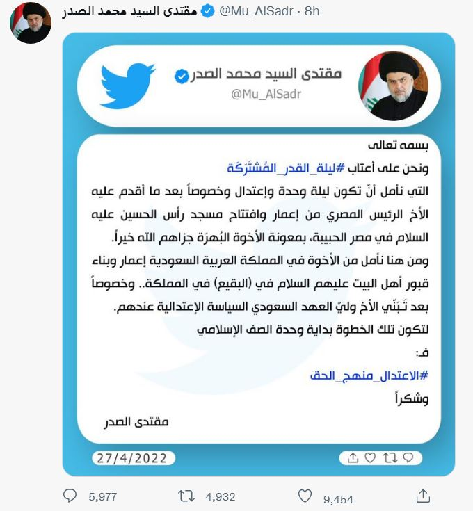 وقال السيد الصدر في تغريدة له على موقع التواصل الاجتماعي "تويتر "ونحن على أعتاب ليلة القدر المشتركة التي نأمل أن تكون ليلة وحدة وإعتدال خصوصاً بعد ما أقدم عليه الأخ الرئيس المصري من إعمار وافتتاح مسجد رأس الحسين (عليه السلام) في مصر الحبيبة، بمعونة الأخوة البهرة جزاهم الله خيراً".
