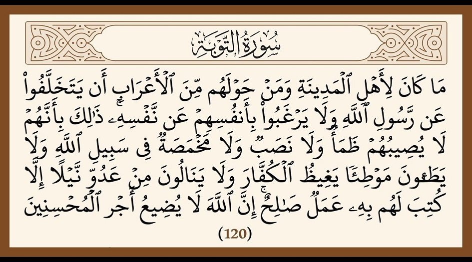 مَا كَانَ لِأَهْلِ الْمَدِينَةِ وَمَنْ حَوْلَهُمْ مِنَ الْأَعْرَابِ أَنْ يَتَخَلَّفُوا عَنْ رَسُولِ اللَّهِ وَلَا يَرْغَبُوا بِأَنْفُسِهِمْ عَنْ نَفْسِهِ ۚ ذَٰلِكَ بِأَنَّهُمْ لَا يُصِيبُهُمْ ظَمَأٌ وَلَا نَصَبٌ وَلَا مَخْمَصَةٌ فِي سَبِيلِ اللَّهِ وَلَا يَطَئُونَ مَوْطِئًا يَغِيظُ الْكُفَّارَ وَلَا يَنَالُونَ مِنْ عَدُوٍّ نَيْلًا إِلَّا كُتِبَ لَهُمْ بِهِ عَمَلٌ صَالِحٌ ۚ إِنَّ اللَّهَ لَا يُضِيعُ أَجْرَ الْمُحْسِنِينَ