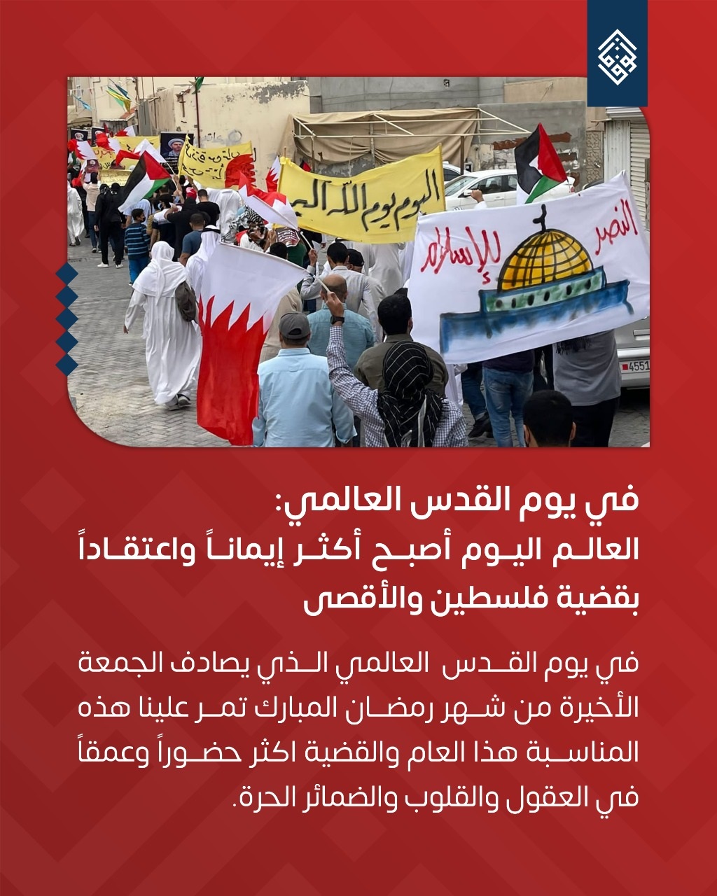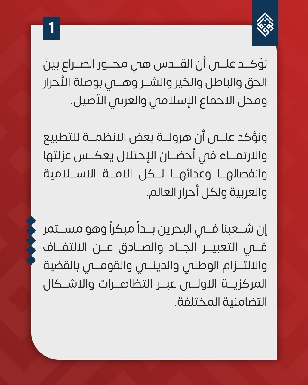 إن شعبنا في البحرين بدأ مبكراً وهو مستمر في التعبير الجاد والصادق عن الالتفاف والالتزام الوطني والديني والقومي بالقضية المركزية الاولى عبر التظاهرات والاشكال التضامنية المختلفة.