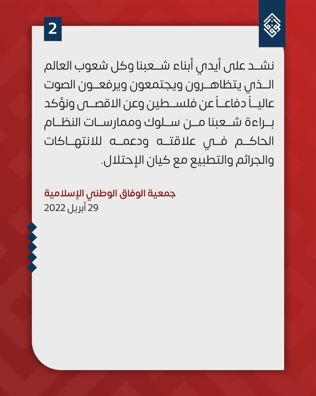 نشد على أيدي أبناء شعبنا وكل شعوب العالم الذي يتظاهرون ويجتمعون ويرفعون الصوت عالياً دفاعاً عن فلسطين وعن الاقصى ونؤكد براءة شعبنا من سلوك وممارسات النظام الحاكم في علاقته ودعمه للانتهاكات والجرائم والتطبيع مع كيان الإحتلال.
