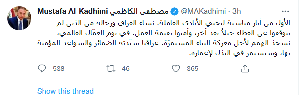 وقال الكاظمي في تغريدة على تويتر، "الأول من أيار مناسبة لنحيي الأيادي العاملة، نساء العراق ورجاله من الذين لم يتوقفوا عن العطاء جيلاً بعد آخر، وآمنوا بقيمة العمل، في يوم العمّال العالمي، نشحذ الهمم لأجل معركة البناء المستمرّة، عراقنا شيّدته الضمائر والسواعد المؤمنة بها، وستستمر في البذل لإعماره".