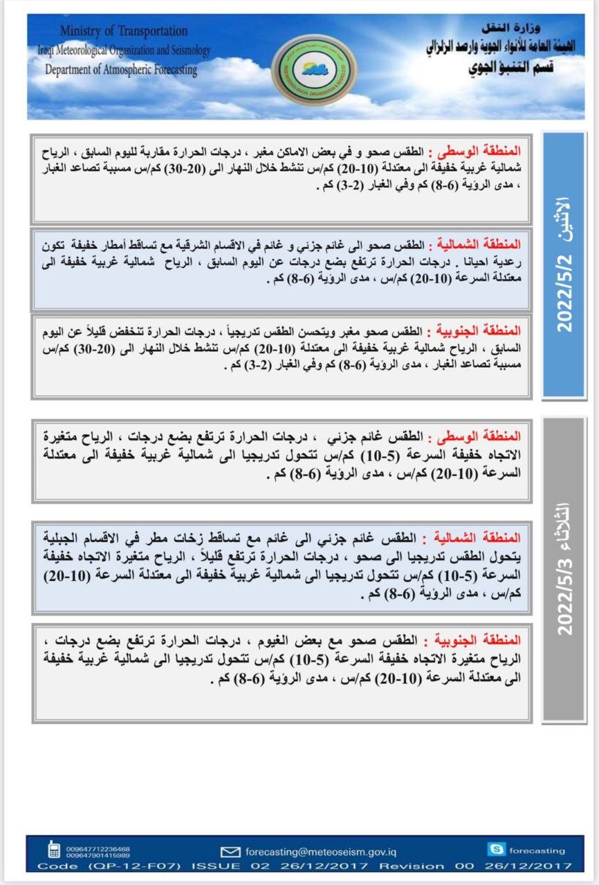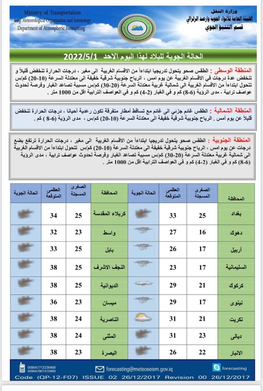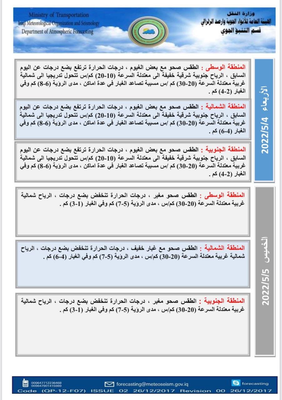 ووفق توقعات الهيئة التي أوردتها في جداول ، فإن "طقس المنطقة الوسطى سيكون اليوم صحواً يتحول تدريجياً إلى مغبر، ودرجات الحرارة تنخفض قليلاً، والرياح ستتسبب بتصاعد الغبار، وكذلك الحال سيكون في المنطقة الجنوبية".