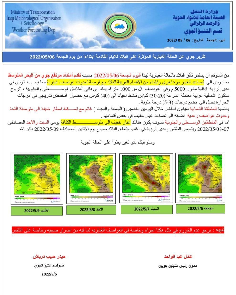 وذكرت الهيئة ، أنه "من المتوقع ان يستمر تأثر البلاد بالحالة الغبارية لهذا اليوم الجمعة، بسبب تقدم امتداد مرتفع جوي من البحر المتوسط مما يؤدي إلى تصاعد الغبار مرة أخرى وابتداءً من الأقسام الغربية للبلاد مع فرصة لحدوث عواصف غبارية مما يسبب تردي في مدى الرؤية الأفقية ما دون 5000 متر، وفي العواصف أقل من 1000 متر، ثم يمتد إلى باقي المناطق الوسطى والجنوبية".