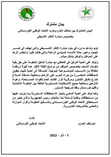 العراق_الكوثر: اصدر تحالف العزم وحزب الاتحاد الوطني الكردستاني فی العراق، اليوم السبت، بيانا مشتركا داعمين فيه المباردة الاخيرة التي طرحها الاطار التنسيقي.