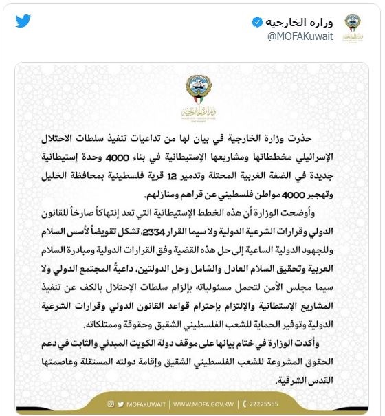 وأكدت الوزارة في ختام بيانها على موقف دولة الكويت المبدئي والثابت في دعم الحقوق المشروعة للشعب الفلسطيني الشقيق وإقامة دولته المستقلة وعاصمتها القدس الشرقية.