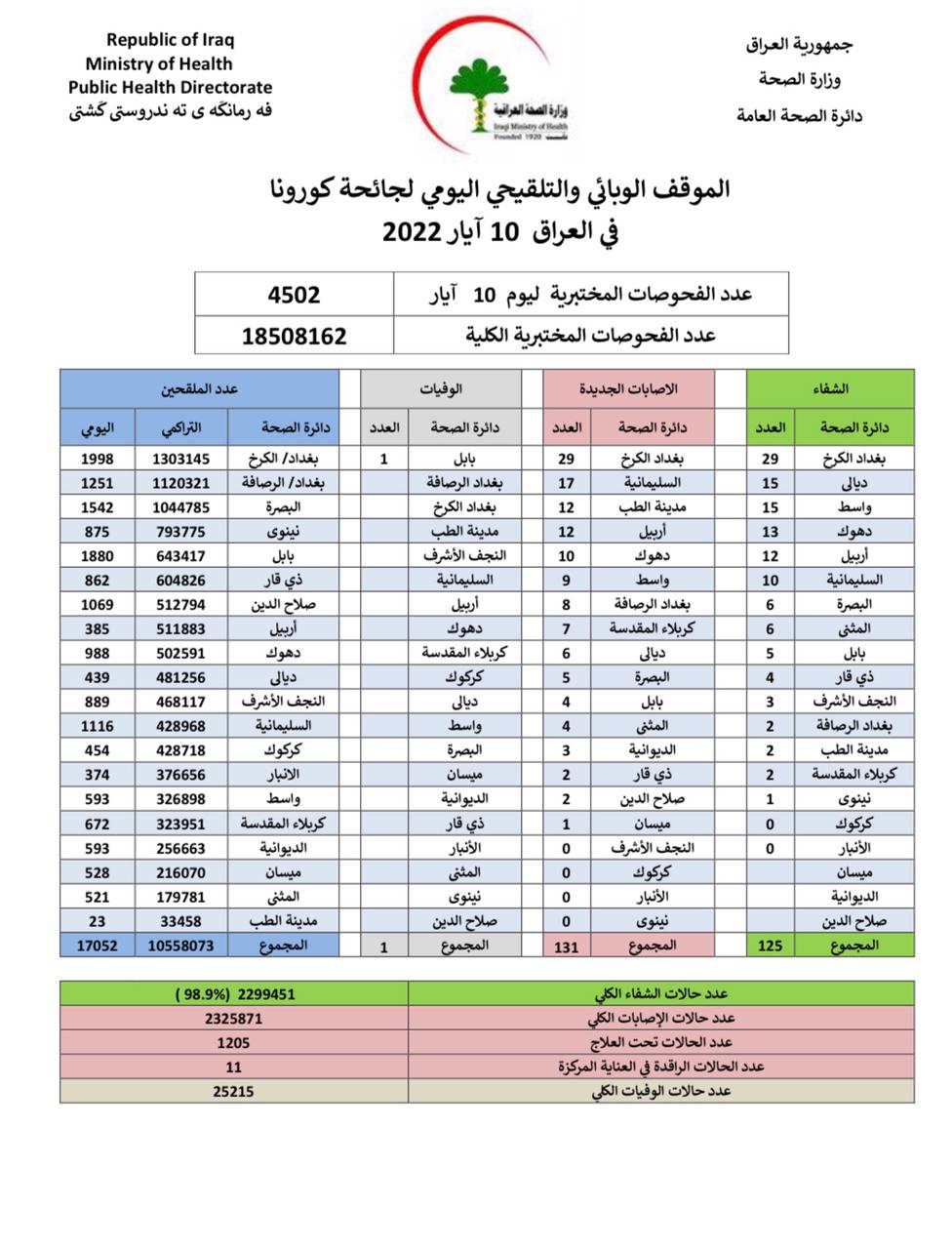 وقالت الوزارة في بيان ، إنها سجلت 131 حالة إصابة جديدة، مقابل تماثل 125 حالة للشفاء، وحالة وفاة واحدة بالفيروس. وأشارت إلى تلقي 17052 للقاح الجائحة خلال يوم واحد.