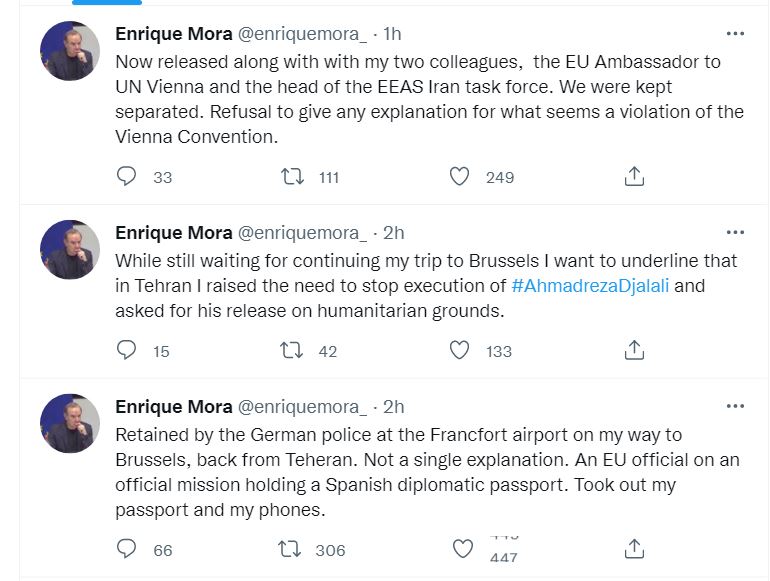 وفي وقت سابق كتب نائب مفوّض الشؤون الخارجية في الاتحاد الأوروبي، جوزيب بوريل لقد تم إطلاق سراحي مع اثنين من زملائي، سفير الاتحاد الأوروبي لدى الأمم المتحدة في فيينا ورئيس المجموعة الخاصة بإيران في خدمة العمل الخارجي للاتحاد الأوروبي" وابقينا منفصلين ورفضوا ان يقدموا أى تفسيراً على ما يبدو أنه انتهاك لاتفاقية فيينا.