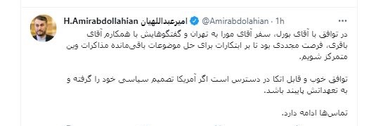 وتأتي تصريحات أمير عبداللهيان في تغريدة نشرها في حسابه على موقع تويتر للتواصل الاجتماعي، تعليقا على زيارة مساعد منسق السياسة الخارجية الأوروبية انريكي مورا لطهران.