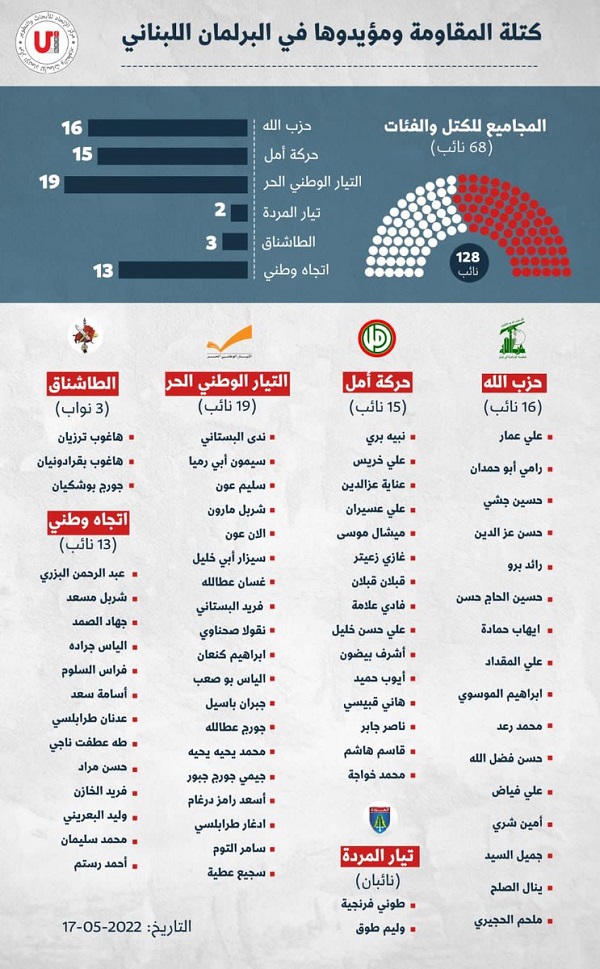 وجاءت أسماء الفائزين من كتلة حزب الله وحلفائها والمقربون منها في البرلمان اللبناني كالتالي: