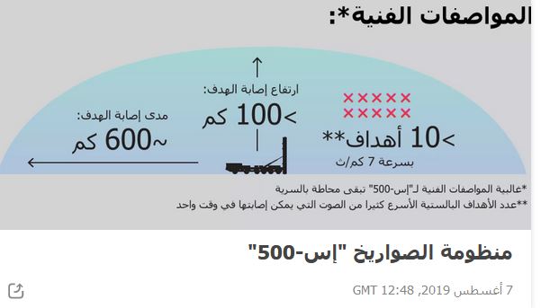 ويبلغ نصف قطر منطقة الإصابة والتدمير لمنظومة "إس 500"، نحو 600 كيلومترا.