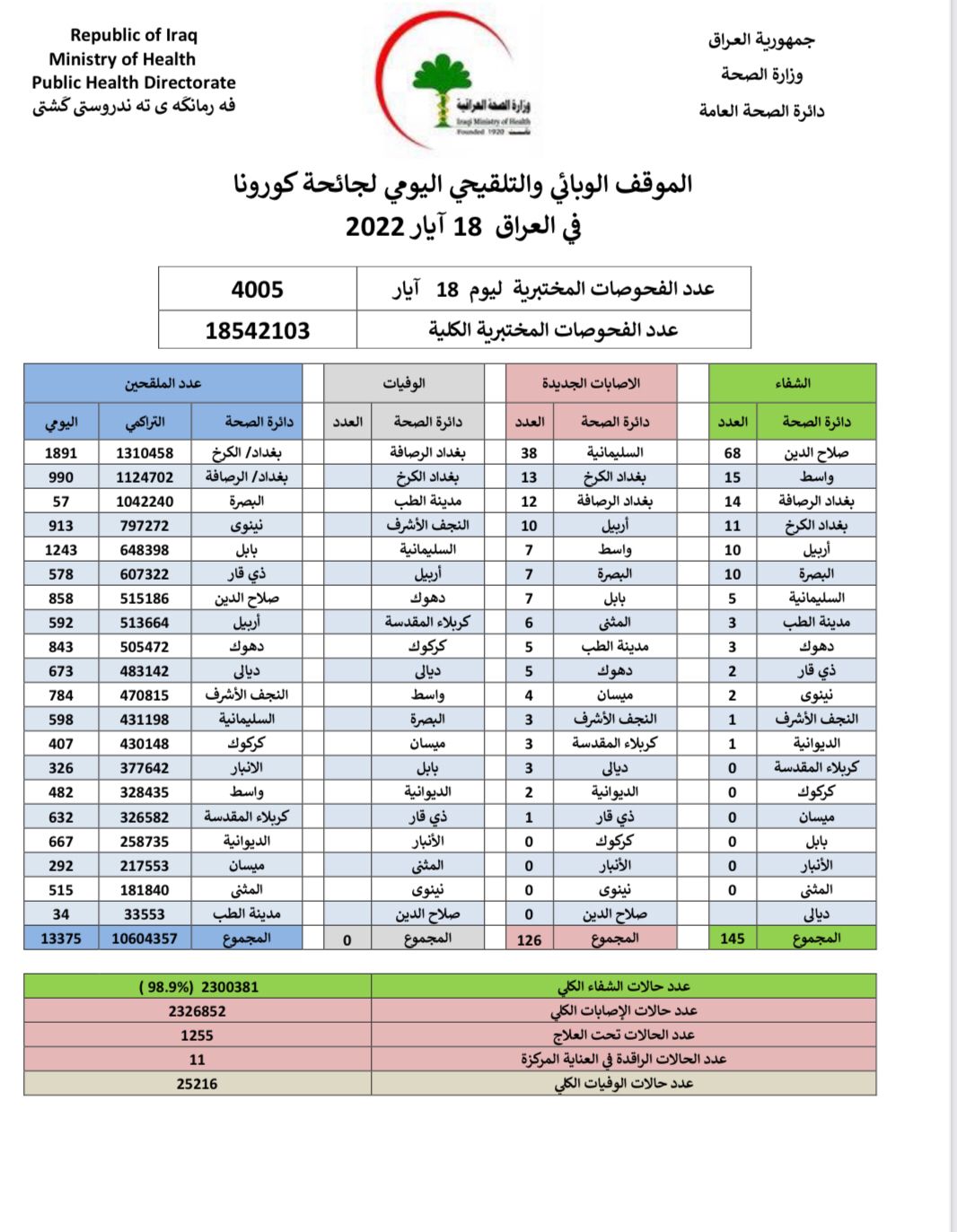 وقالت الوزارة في بيان، إنه تم تسجيل 126 إصابة جديدة، مقابل تماثل 145 حالة للشفاء، دون وفيات بالفيروس خلال 24 ساعة الماضية.