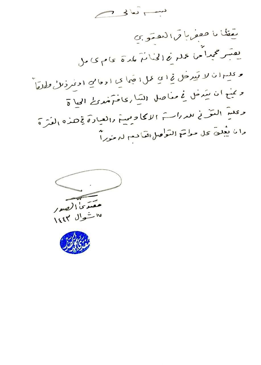 وأضاف، "وعليه التفرغ للدراسة الأكاديمية والعبادة في هذه الفترة وأن يغلق كل مواقع التواصل التابعة له فوراً".