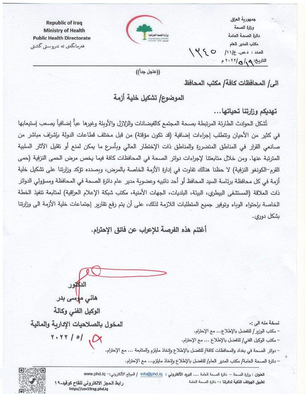 وقالت الوزارة في وثيقة، إنها "أشرت تفاوتاً في إدارة الأزمة الخاصة بالمرض بين المحافظات العراقية"، موجهة "بتشكيل خلية أزمة في كل محافظة برئاسة المحافظ أو أحد نائبيه وعضوية مدير عام دائرة صحة المحافظة ومسؤولي الدوائر ذات العلاقة".