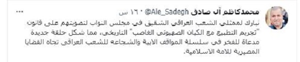 وكتب آل صادق في تغريدة على صفحته الشخصية على تويتر : نبارك لممثلي الشعب العراقي الشقيق في مجلس النواب لتصويتهم على قانون "تجريم التطبيع مع الكيان الصهيوني الغاصب" التاريخي، مما شكل حلقة جديدة مدعاة للفخر في سلسلة المواقف الابية والشجاعه للشعب العراقي تجاه القضايا المصيرية للامة الاسلامية.