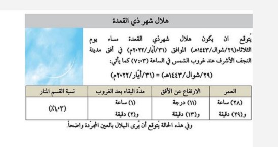 يتوقع ان يكون هلال شهر ذي القعدة مساء يوم الثلاثاء29/ شوال 1443هـ) الموافق (31/آيار 2022) في أفق مدينة النجف الأشرف عند غروب الشمس في الساعة (07:03) كما يأتي