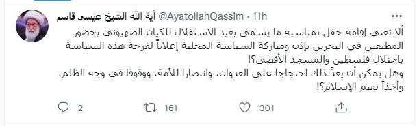 وتساءل الشيخ عيسى قاسم مستنكراً في تغريدة له عبر تويتر "هل يمكن أن يعد ذلك احتجاجاً على العدوان وانتصاراً للأمة ووقوفاً في وجه الظلم وأخذاً بقيم الإسلام".