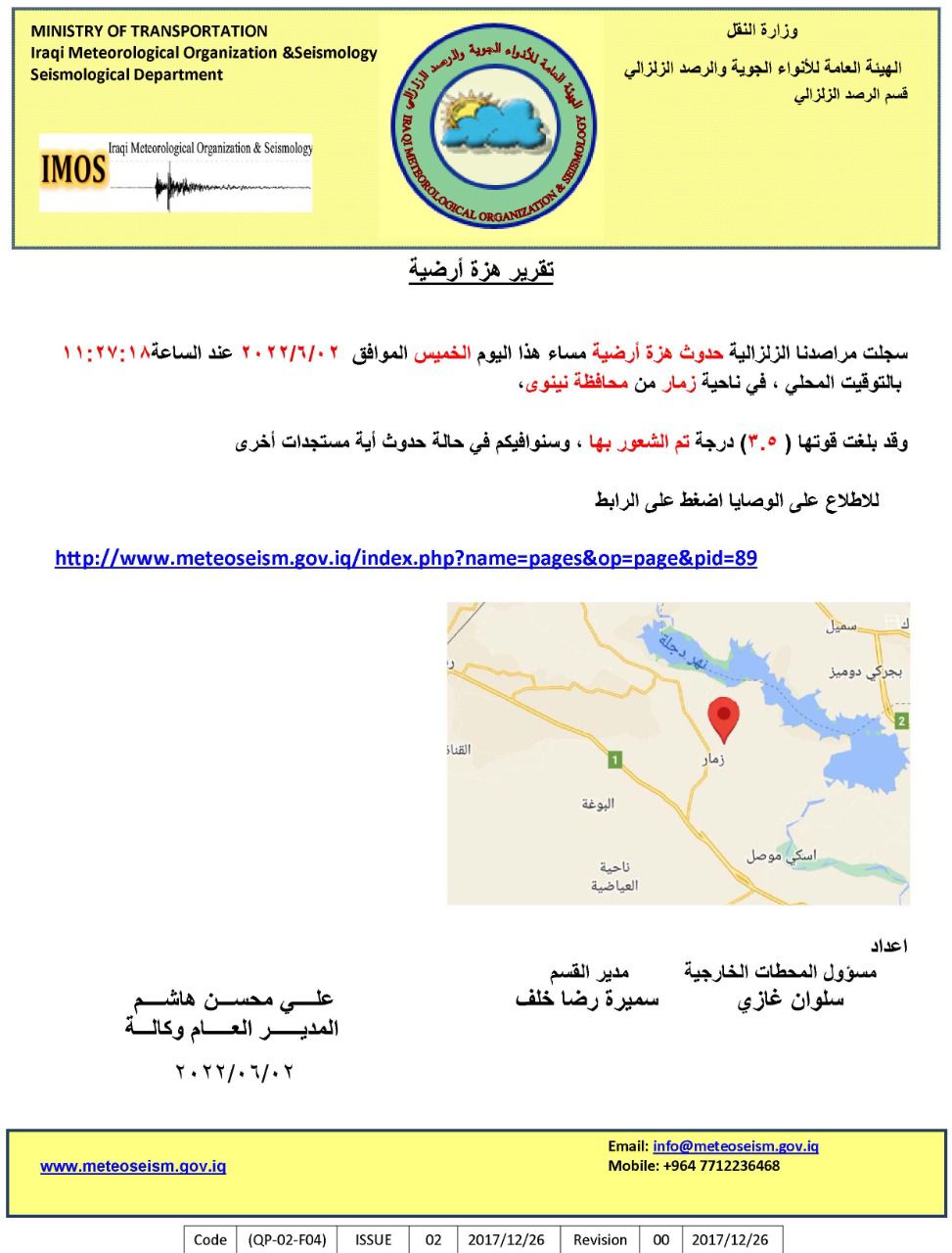 وبين التقرير، أن "الهزةالأرضية سجلت في تمام الساعة 11:27:18 مساء اليوم بالتوقيت المحلي وقد بلغت قوتها (3،5) درجة في ناحية زمار من محافظة نينوى".