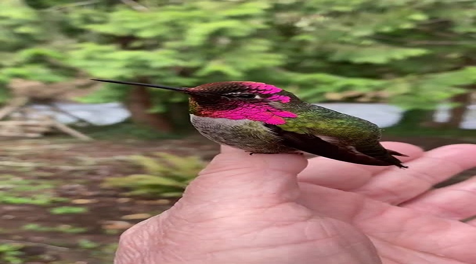 ظل الطائر صغير الحجم يتلفت ويغير لونه لعدة لحظات قبل أن يترك يد مصور الفيديو ويحلق على بعد تراوح بين 2 إلى 4 أقدام من وجه المصور، ويطير بعيدا.