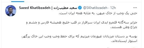 وكتب خطيب زادة في تغريدة على تويتر مساء السبت حول الجزر الايرانية الثلاث "تنب الكبرى وتنب الصغرى وابو موسى": حتى شبر واحد من تراب الوطن الغالي هو بمثابة الوطن كله.