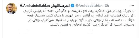 وفي تغريدة له عشية اجتماع مجلس محافظي الوكالة الدولية، قال، أميرعبداللهيان، تشاورنا مع جوزيف بوريل بشأن مفاوضات رفع العقوبات وكيفية الاستمرار بها.