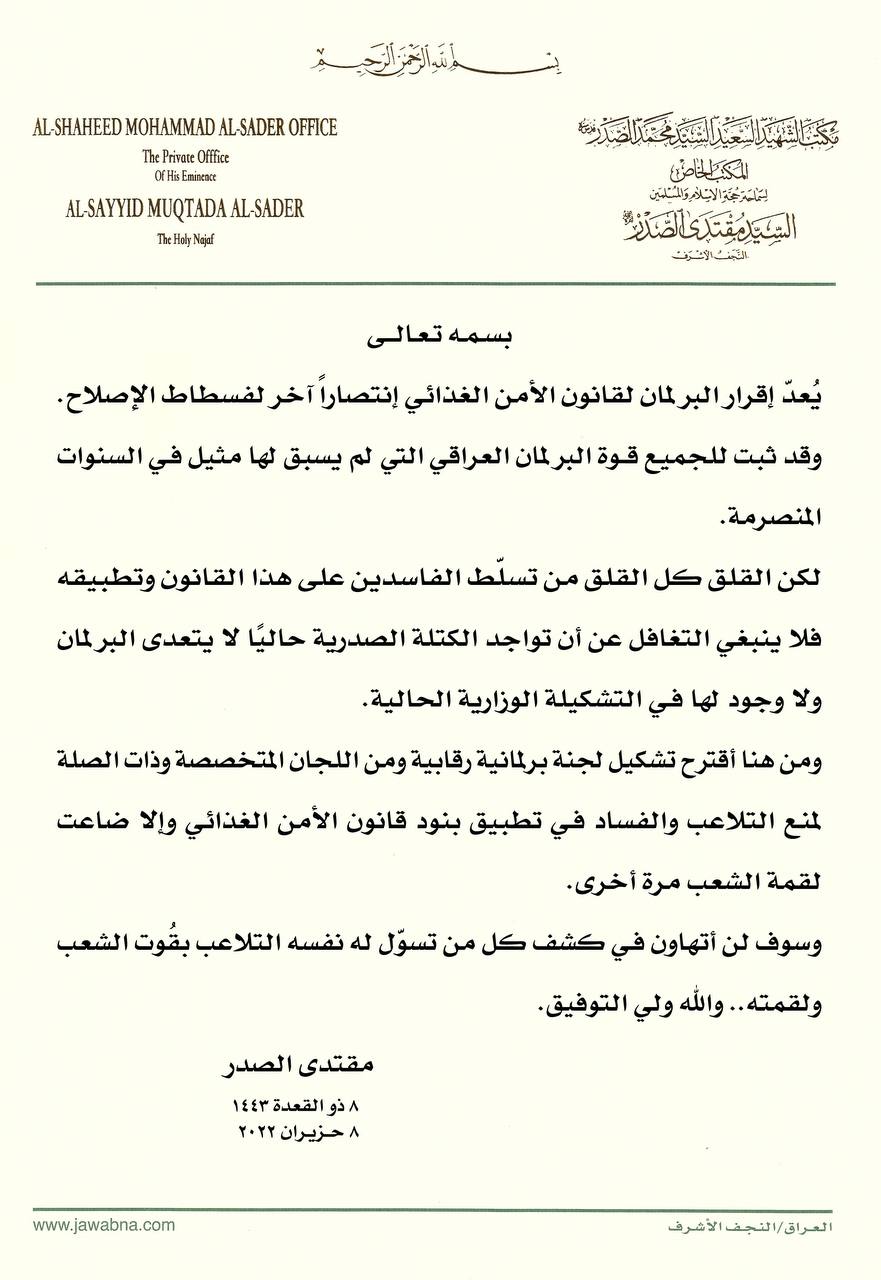 السيد مقتدى الصدر يصدر بيانا بعد إقرار قانون الدعم الطارئ +الوثيقة