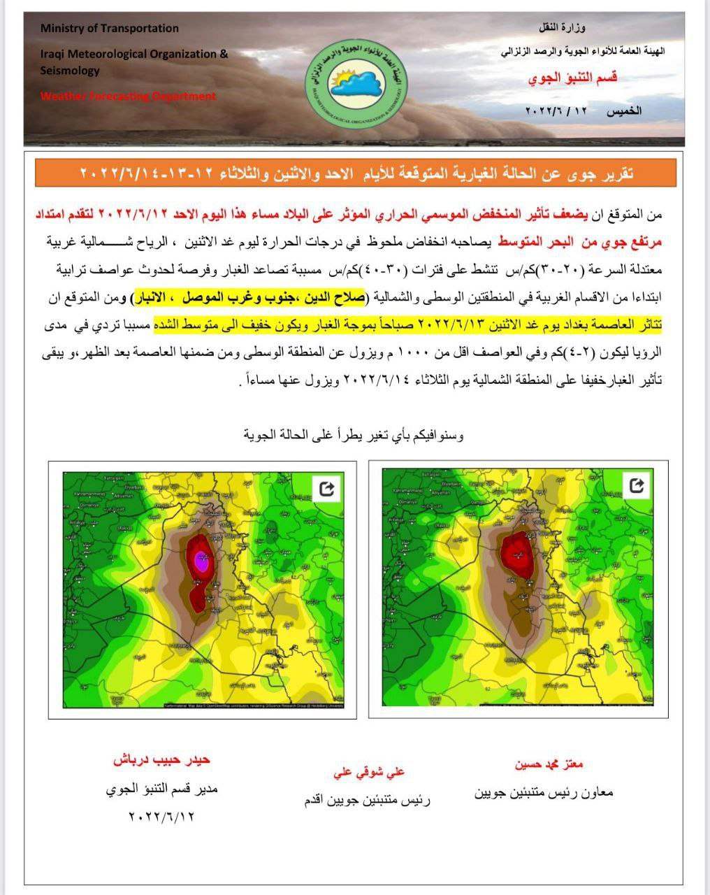 واضافت ان "الرياح شمالية غربية معتدلة السرعة تنشط على فترات مسببة تصاعد الغبار وفرص لحدوث عواصف ترابية ابتداءا من الاقسام الغربية في المنطقتين الوسطى والشمالية (صلاح الدين، جنوب وغرب الموصل، الانبار)".