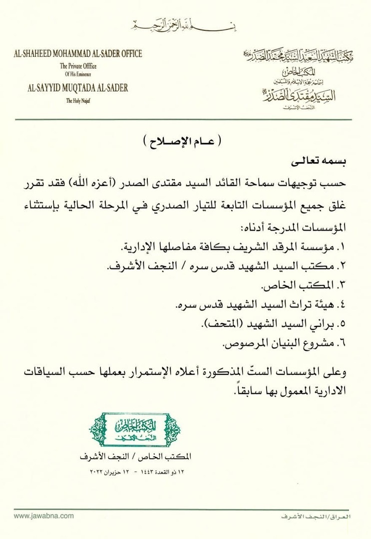 وقال المكتب في بيان "حسب توجيهات مقتدى الصدر فقد تقرر غلق جميع المؤسسات التابعة للتيار الصدري في المرحلة الحالية باستثناء البعض".