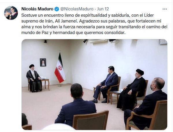 وكتب مادورو، في رسالة على صفحته على “تويتر”، مشيرا الى لقائه مع الإمام الخامنئي: “كان لدي لقاء روحيا وحكيمابالامام الخامنئي”.