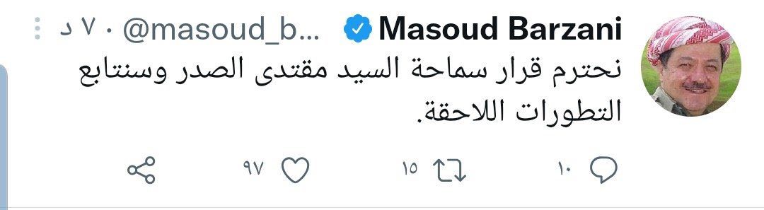 وقال بارزاني في تغريدة على موقع "تويتر": "نحترم قرار سماحة السيد مقتدى الصدر وسنتابع التطورات اللاحقة".