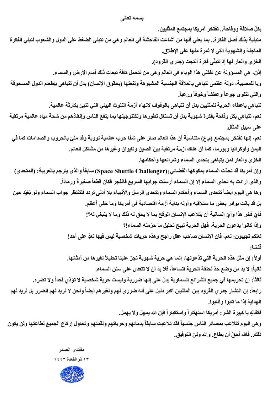 وقال الصدر في بيان ، إن "الولايات المتحدة تفتخر بمجتمع المثليين متبنية بذلك أصل الفكرة التي انتجت جدري القرود، إذن هي المسؤولة عن تفشي هذا الوباء في العالم". وأضاف، أن "أمريكا تتلاعب اليوم بمصائر الناس جنسياً فقد تلاعبت سابقاً بدمائهم وحرياتهم ولقمتهم وتحاول إركاع الجميع لطاعتها ولن يكون ذلك".